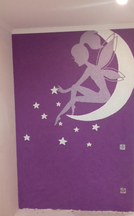 - Жидкие обои оставляют большой простор для творчества и воображения. В продаже есть очень много расцветок, а по желанию купленный состав можно самостоятельно дополнить. Предложите сделать это ребенку.